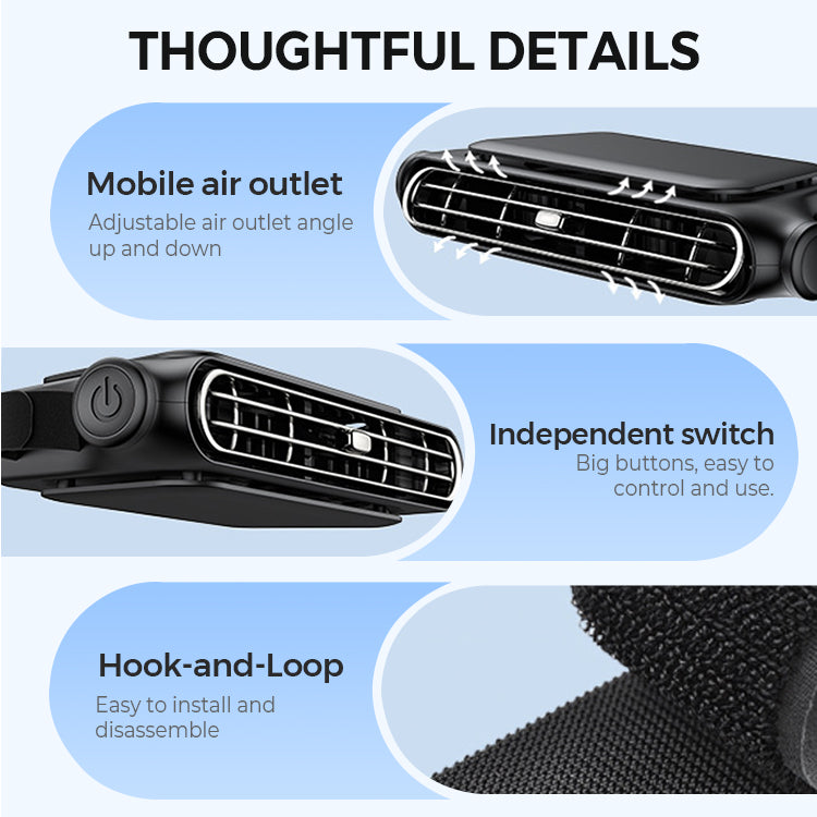 SÄKER FÄSTNING: De medföljande magiska klistermärkena ger en fast och stabil fastsättning på bilens nackstöd, vilket förhindrar att fläkten skakar eller faller under drift. Detta säkra monteringssystem säkerställer att fläkten sitter på plats även på guppiga vägar, vilket bibehåller ett jämnt luftflöde utan manuell justering.