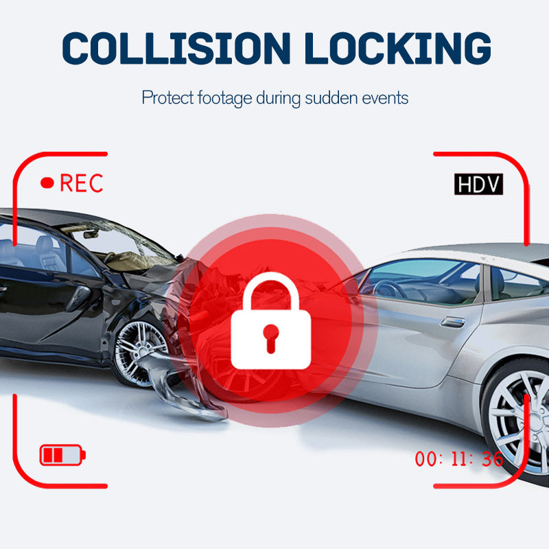 NĂDKOLLISIONSLĂ S: Skydda viktiga bilder i nödsituationer. Inbyggd 3-axlig gravitationssensor lĂ„ser inspelningar vid kollisioner eller plötsliga inbromsningar, vilket förhindrar att bilderna skrivs över.