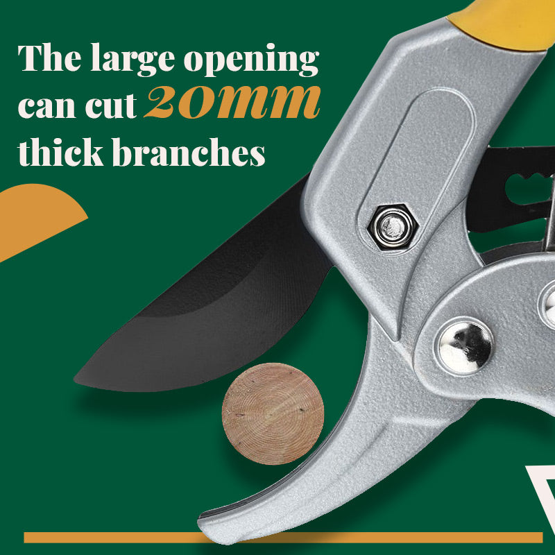 Fjädern i rostfritt stål matchas med en professionell segmenterad hävstång som sparar arbete, och delningskraften ökar med 3 gånger. Den stora öppningen kan kapa 20 mm tjocka grenar, vilket minskar trötthet och ömhet i händerna.