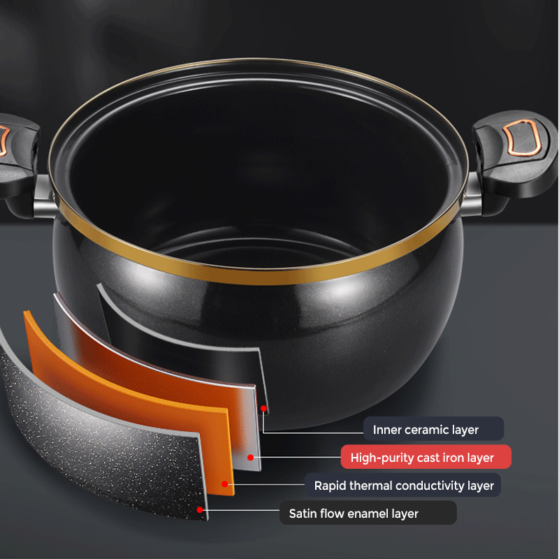HĂ LLBAR FLERSKIKTSKONSTRUKTION: Byggd med flera skyddande lager â inklusive en slĂ€t emaljyta, ett snabbt vĂ€rmeledningsskikt, en robust gjutjĂ€rnskĂ€rna och en inre keramisk vĂ€gg â vilket ger jĂ€mn uppvĂ€rmning, lĂ„ngvarig styrka och sĂ€ker kontakt med livsmedel.