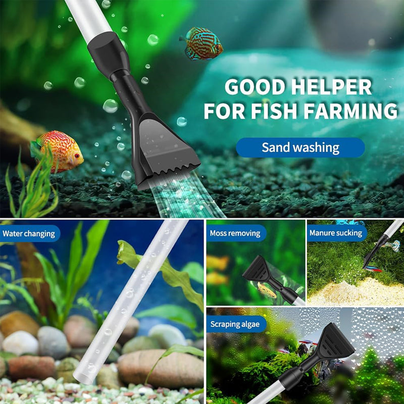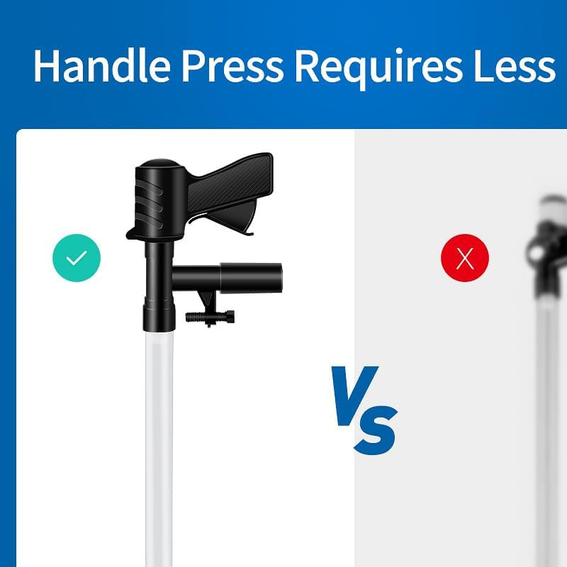 ENKELT OCH SNABBT VATTENBYTE: Denna pneumatiska akvarievattenbytare förenklar processen med bara några få tryck på det ergonomiska handtaget. Designen styr vatten- och skräpflödet effektivt, vilket gör att du kan ta bort smutsigt vatten utan att störa fiskar eller växter. Det transparenta röret låter dig övervaka rengöringsprocessen och garanterar en kladdfri upplevelse.
