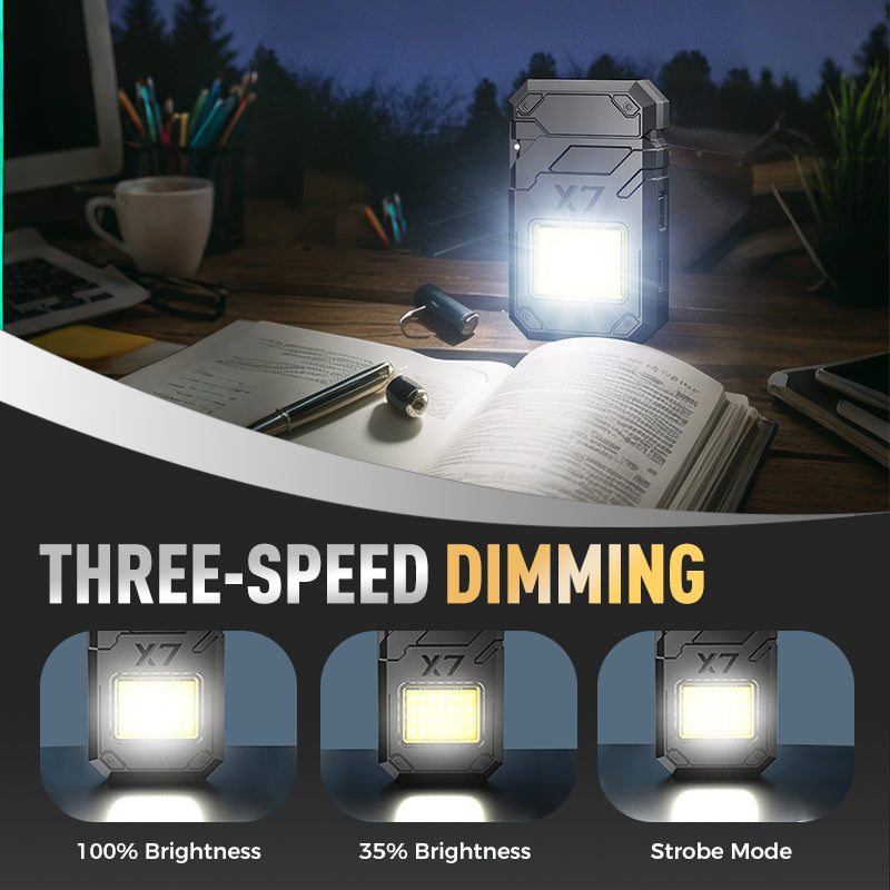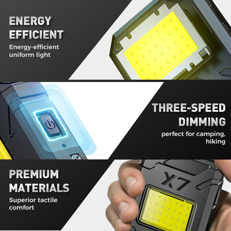 COB-BELYSNING MED TRE STEGS DIMMING: Utrustad med ett starkt COB-ljus som erbjuder tre justerbara ljusstyrkenivåer, så att du enkelt kan anpassa den efter olika belysningsbehov – perfekt för camping, vandring eller nödfall.