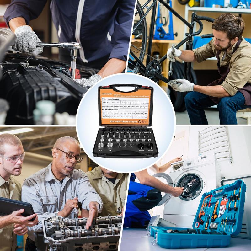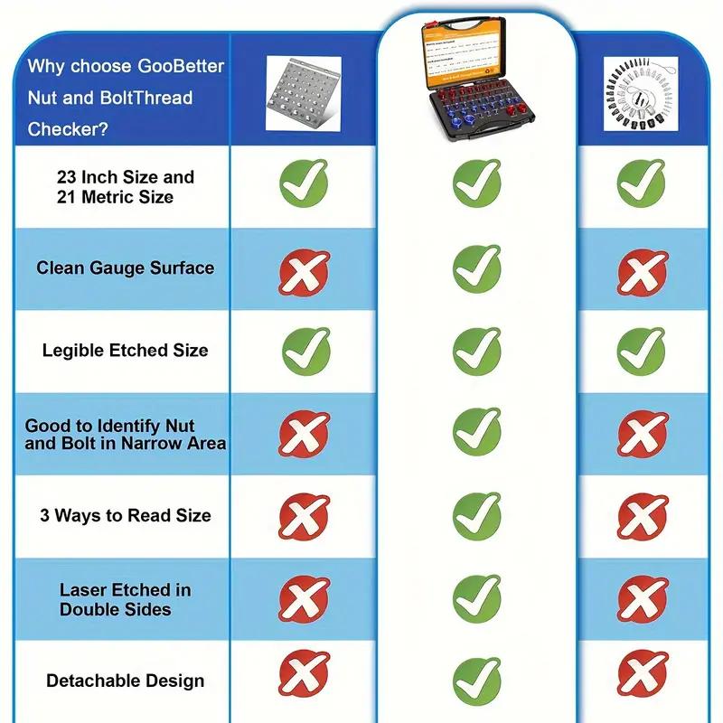 FörbÀttrad effektivitet: Skruva bara in muttern eller bulten i gÀngmÀtaren, det tar nÄgra sekunder att kontrollera storleken. Dessutom Àr denna mutter- och bultmÀtare sÀrskilt vÀl lÀmpad för att skilja mellan liknande tum- och metriska gÀngor.