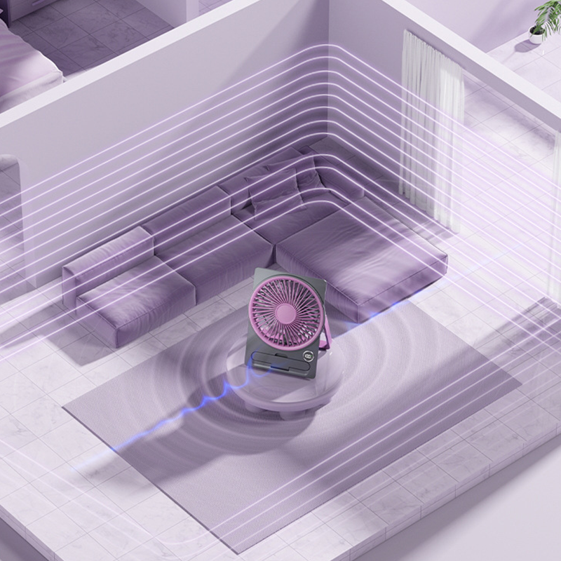 MÄngsidig anvÀndning med hÀngande och stÄende alternativ: Denna flÀkt kan hÀngas eller placeras pÄ en plan yta för enkel anvÀndning. Vindfunktionen med 180° vidvinkel sÀkerstÀller att den svala luften nÄr alla delar av rummet och lÀmnar ingen flÀck orörd. Oavsett om du arbetar vid skrivbordet eller hÀnger upp den i ett tÀlt ger flÀkten kontinuerlig och effektiv kylning frÄn alla vinklar.