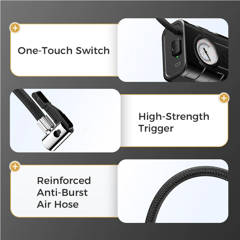 SNABB UPPLÅSNING OCH NOGGRANN TRYCKMÄTNING: Denna trådlösa luftpump för bil är utformad för snabb påfyllning och gör det möjligt att fylla däcken snabbt och effektivt. Med en noggrann tryckmätare kan du enkelt kontrollera däcktrycket och säkerställa optimal prestanda och säkerhet. Slipp vänta i onödan – kom tillbaka ut på vägen på nolltid med exakta mätvärden nära till hands.